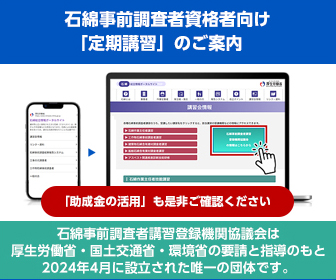 石綿作業主任者技能講習、工作物石綿事前調査者講習、建築物石綿含有建材調査者講習 石綿講習 石綿作業主任者技能講習 石綿(アスベスト)作業の安全管理と指導を担うために必要な国家資格を取得する講習です。 詳細はこちら 工作物石綿事前調査者講習 炉設備、電気設備、配管及び貯蔵設備などの工作物における石綿(アスベスト)の有無を調査するための専門知識を習得し、法令に基づいた事前調査を担う資格を取得する講習です。 詳細はこちら 建築物石綿含有建材調査者講習 建築物に使用された建材に石綿(アスベスト)が含まれているかを調査し、法令に基づく記録・報告業務を適切に遂行するための専門資格を取得する講習です。 詳細はこちら